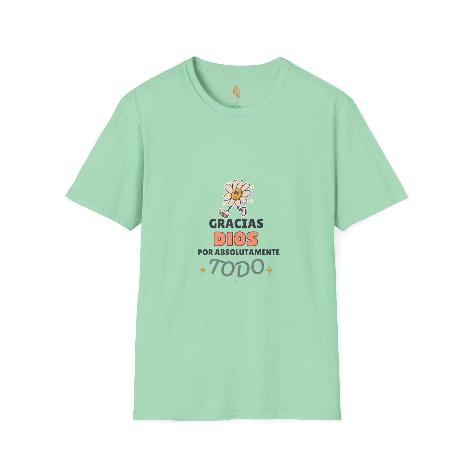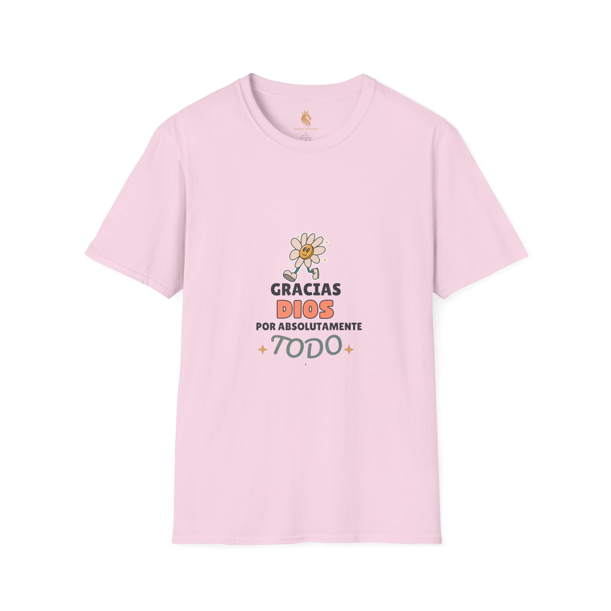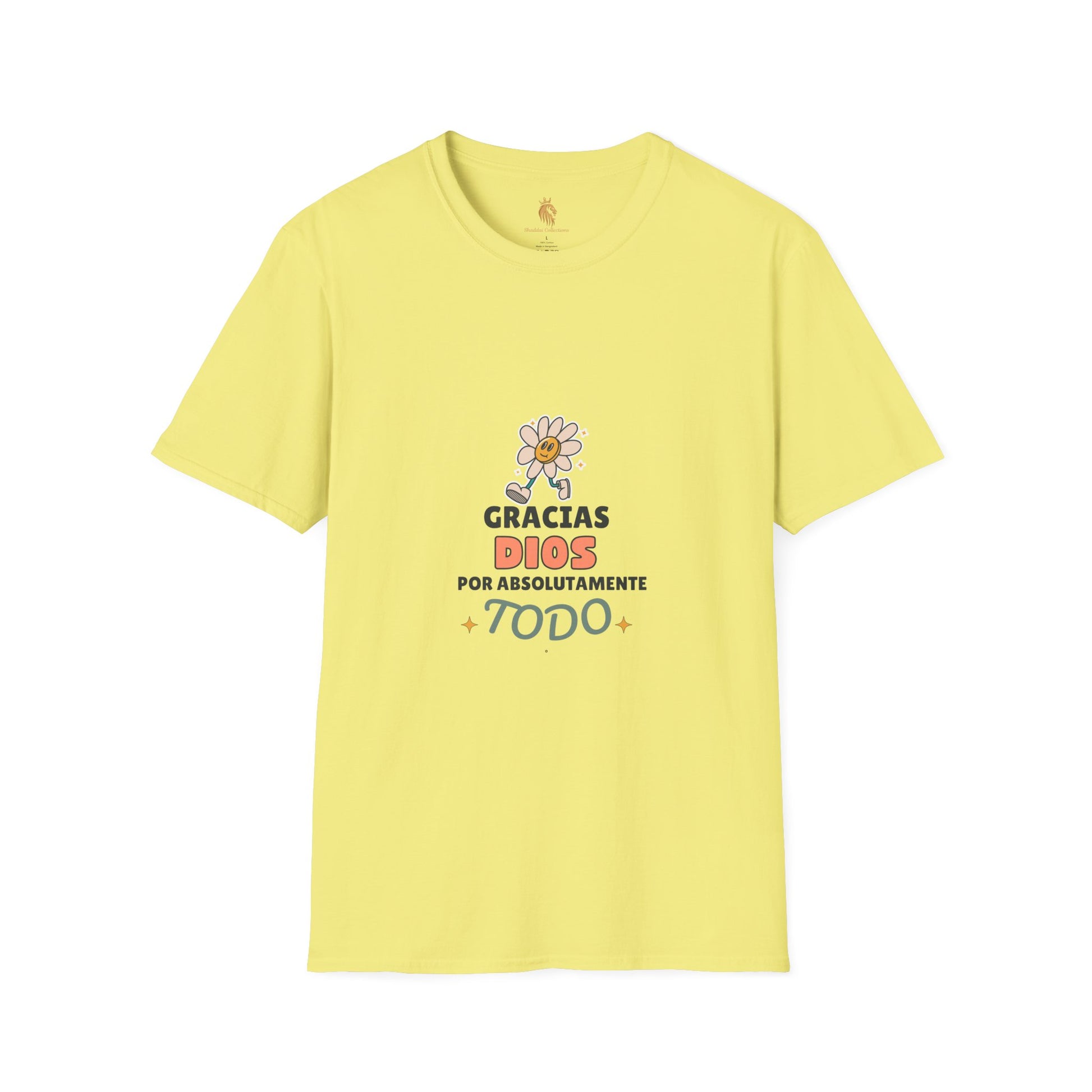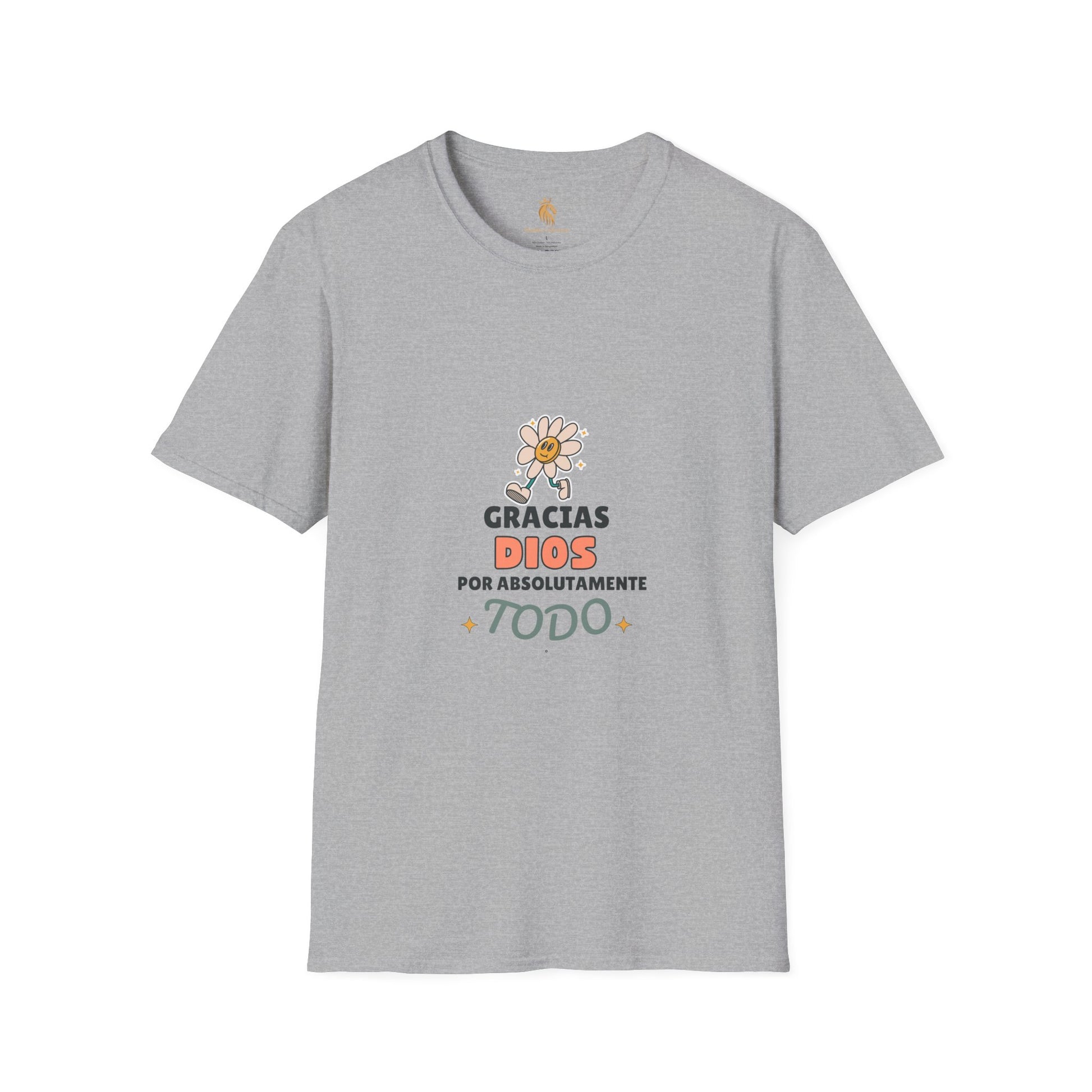 Introducing a unisex t-shirt that radiates positivity and gratitude. This comfortable tee features a cheerful design that says 'Gracias Dios por absolutamente Todo', making it perfect for everyday wear. Imagine slipping into this soft, lightweight fabric that feels like a gentle embrace while you go about your day. Ideal for casual outings, family gatherings, or cozy nights in, this shirt embodies a laid-back vibe that fits seamlessly into any wardrobe. Perfect for anyone wishing to express their thanks and spread happiness, it's a lovely choice for occasions like Family Appreciation Day, Thanksgiving, or just a thoughtful gift for someone special. Whether it's a casual day out or celebrating life's little blessings, this t-shirt is sure to bring a smile to your face.