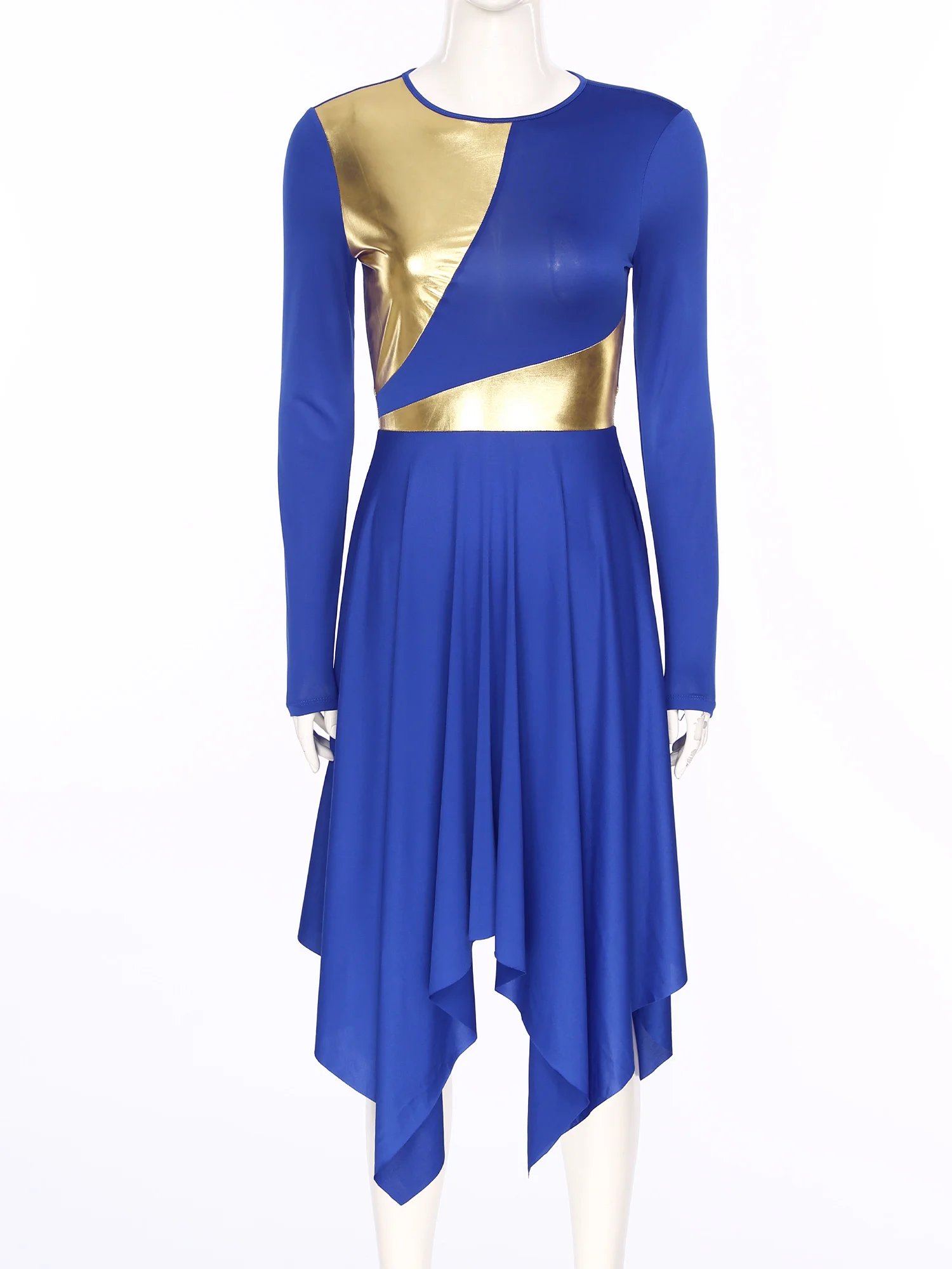 The bodice of the dance dress is designed with a metallic color block to brighten up any performance.
